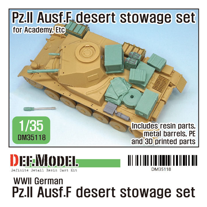 The Panzer II had many, many miles to go in wartime, and soldiers and crews piled these with all of the extra fuel, food and stores that they could fit on them. Def Model has made a resin and metal set to match the Academy tank. We are sure it could fit a few more Panzer IIs also...Twenty-five resin parts, a metal main barrel for the gun and photo-etch for the frames and straps are included in this set.