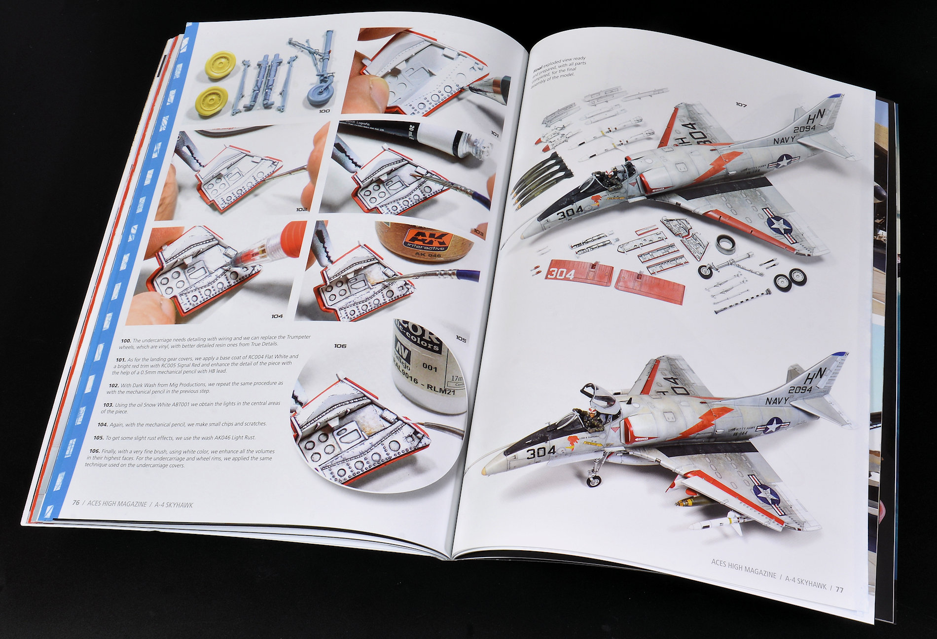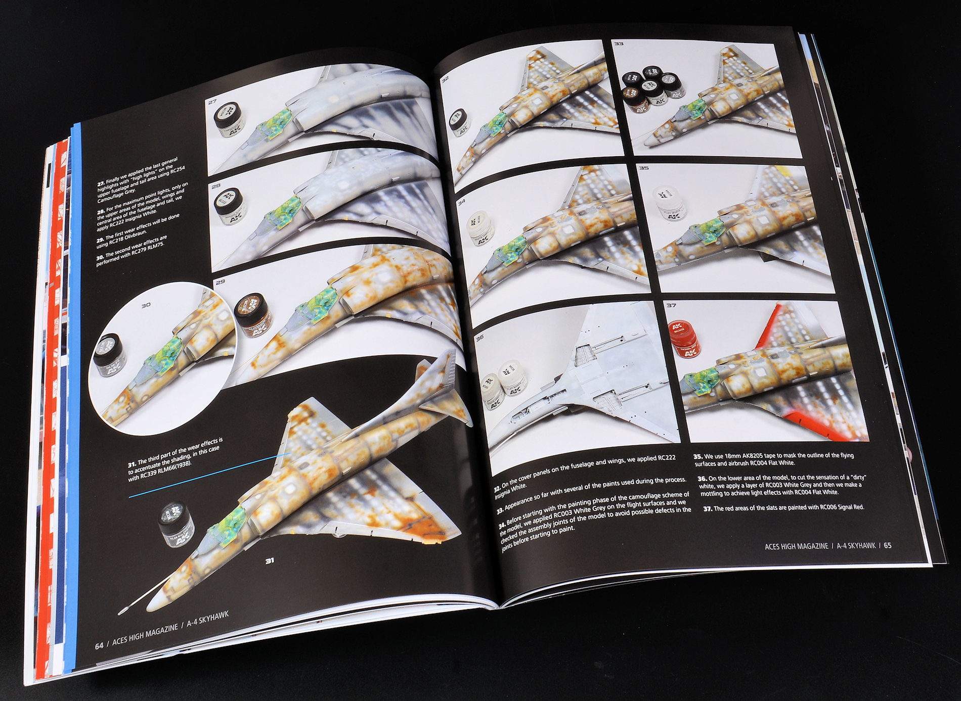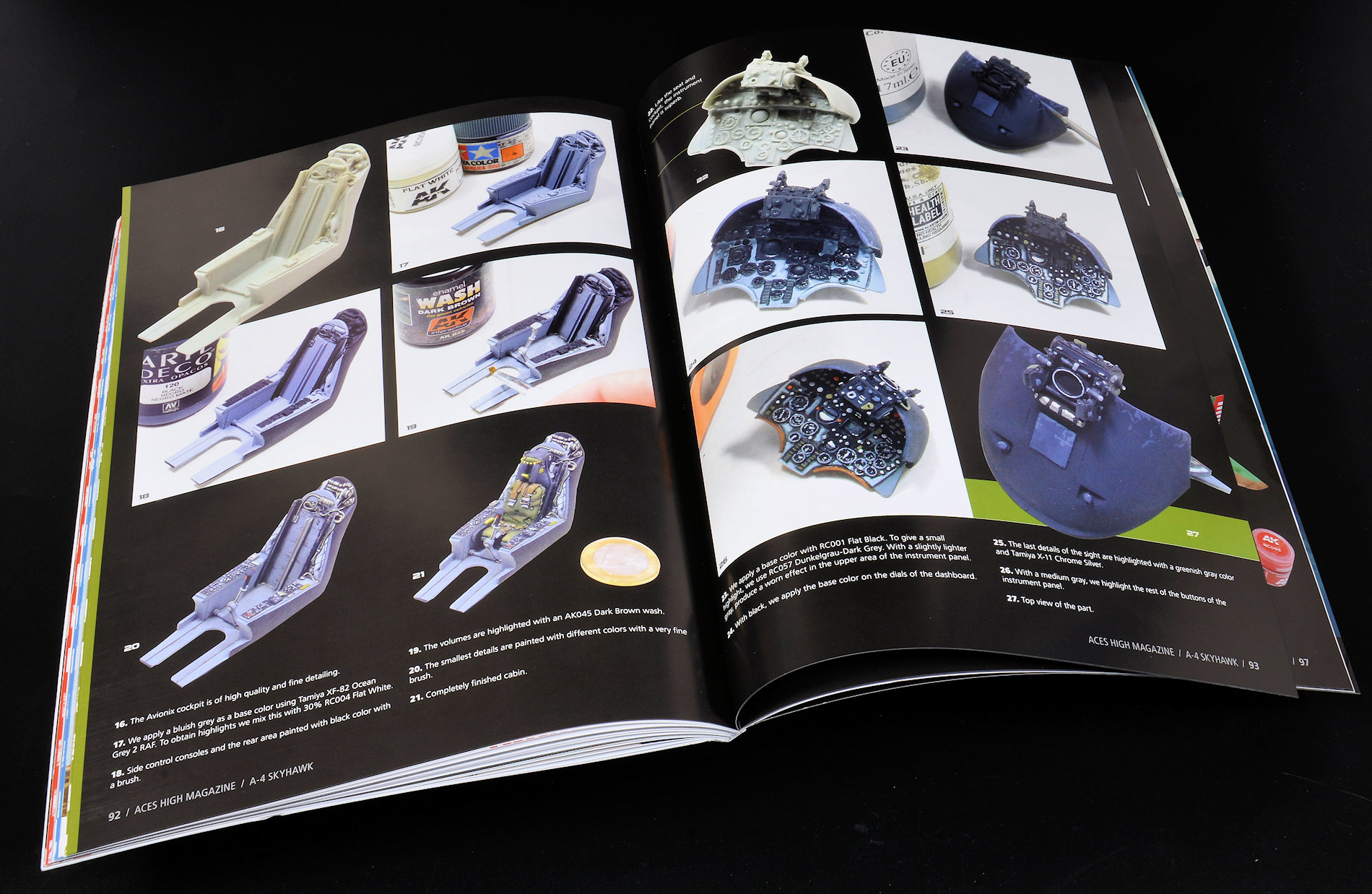 The second modelling subject is next, with the U.S. Navy A-4E by Daniel Zamarbide, this time the Trumpeter kit with modifications to the cockpit and wheel wells plus a pilot from PJ productions along with some Eduard add ons. Again, we see these additions for the most part being added to the model from Mr Zamarbide, but unfortunately there are only over four pages. What IS very good is the explanation of the painting of the kit, and the use of shading to bring about interest in an otherwise all-grey monocoloured exterior. The SBS approach, the show and tell of jus tow he creates his models and the steps he uses to bring them to life, works extremely well here. Each numbered photo has a companion in the numbered text captions which describe the actions being undertaken and why these are done in this way. The end result is a beautiful aircraft, brought to life with a lot more colour than I thought and several artistic flourishes that are a trademark of the modeller's style.The last of the Skooters we are shown are the Israeli Air Force A-4N's. The background section again gives us the history of the aircraft in a brief fashion whilst in service in the IAF. The "N" model's interesting features, powerplant and features are shown and described here over seven pages of text and full-colour contemporary photos of the aircraft (unfortunately none shown in conflict scenarios). These photos are accompanied with captions to flush out the story, while the photos show these hump-backed aircraft and the colours, faded and aged over time to good effect. The text explains to the reader just why these cooters were such a highly praised machine by the IAF.